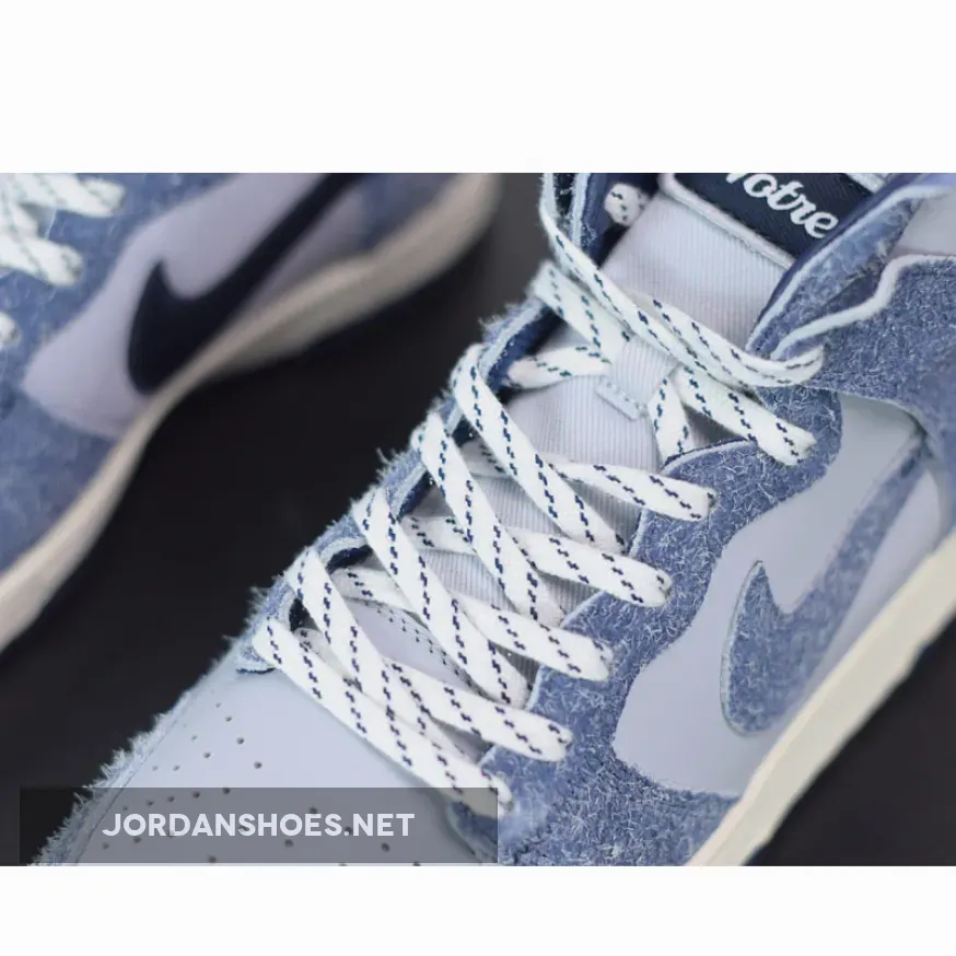 the mid-west boutique’s forthcoming collaboration features hairy suede overlays atop a light blue leather base. Detachable nametag-like “Notre” labels arrive with the sneakers, and when attached, sit underneath the Swoosh’s iconic branding. Laces also don a bit of personality given their striped detailing. The ostensibly navy accents, however, are overshadowed by the medial sides logos, which are created using Notre’s now-signature handshake motif; the left-side arm traces back to a non-standard heel pull tab made from canvas. Underfoot, the Dunk High ostensibly nods to its debut 1985 year given its slightly-yellowed midsole, which is accompanied by a deep blue outsole.