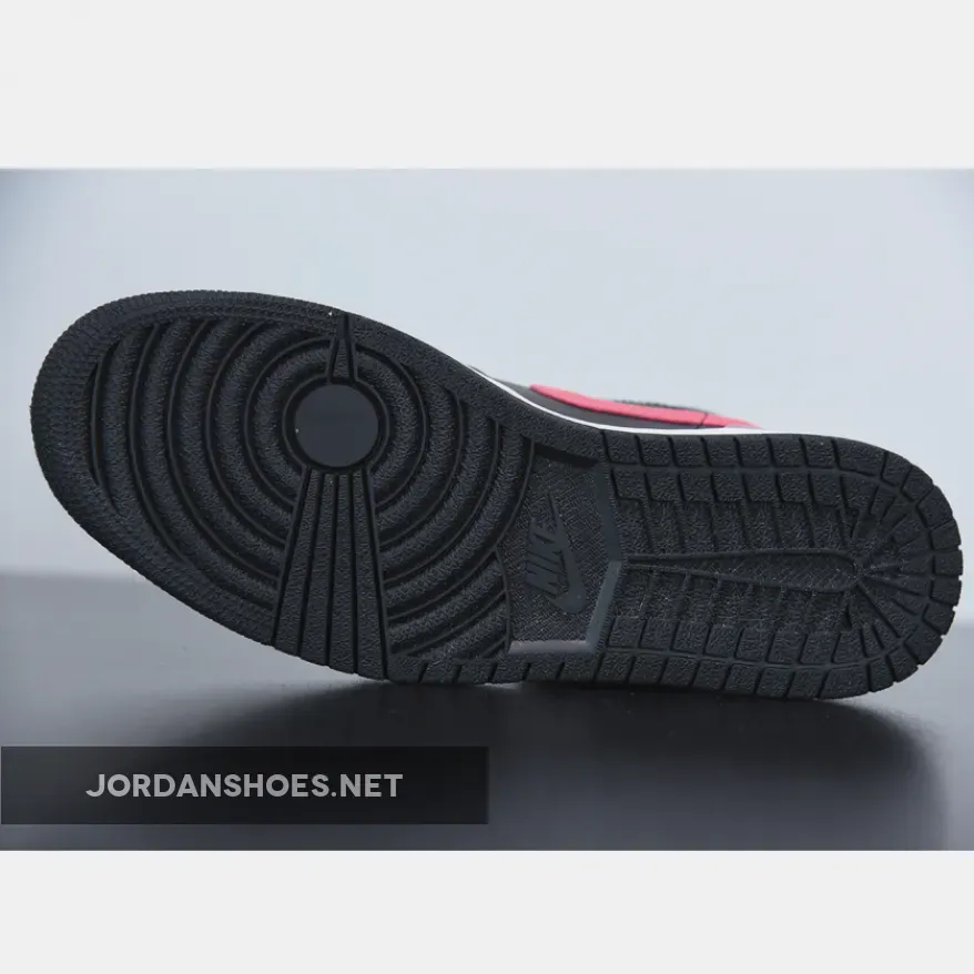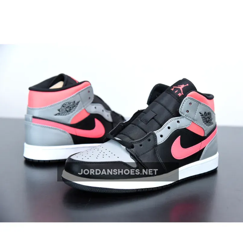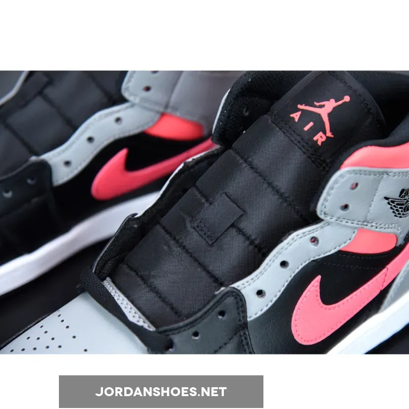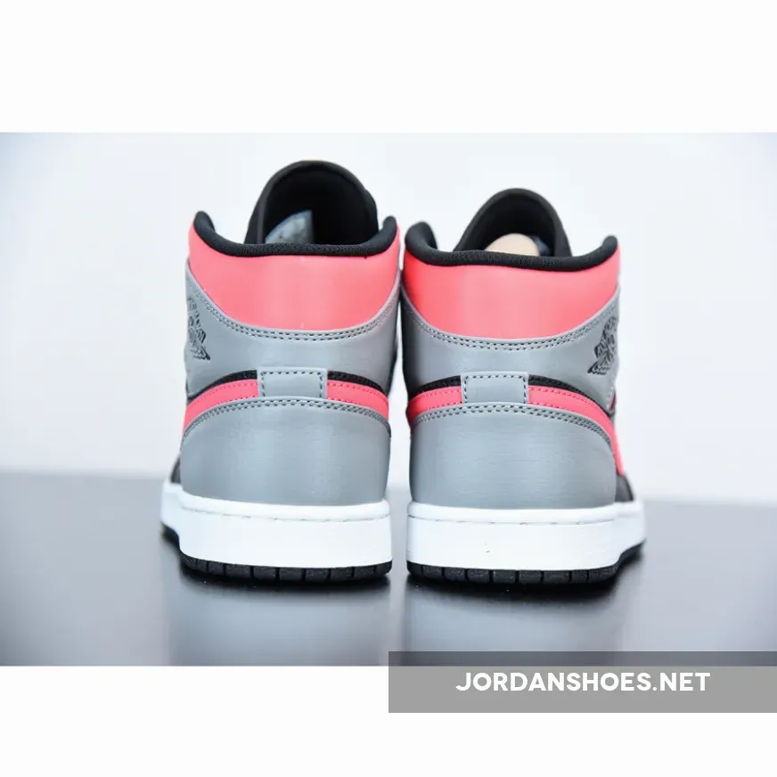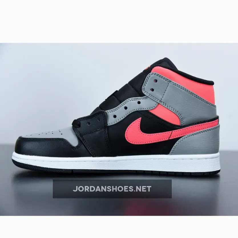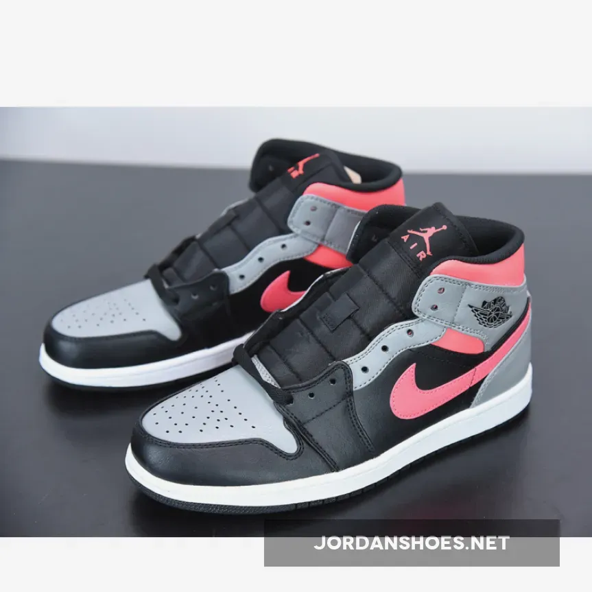 The Jordan 1 Mid Pink Shadow comes in black, light Smoke Grey, and Hot Punch colorways that clear the designs. This sneaker is made of leather, suede, synthetic, and rubber material. It features the Air Jordan logo at the sides close to the quarter and two Hot Punch Swooshes on the sides. The Hot Punch Jumpman logo rests on the tongue of the sneaker.