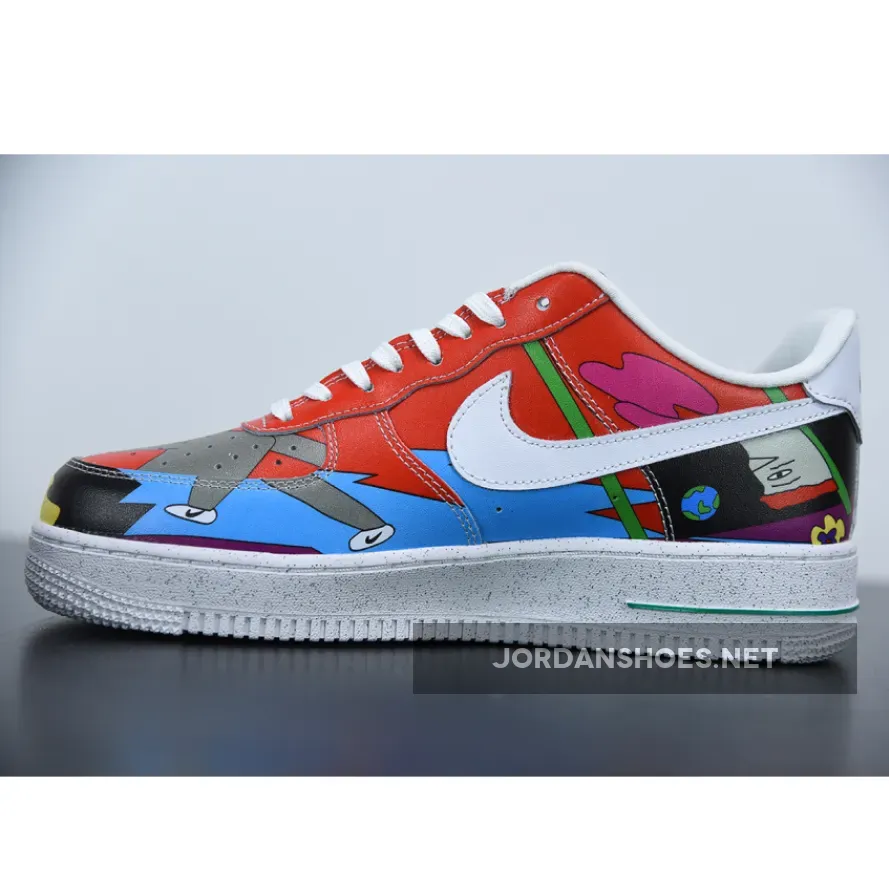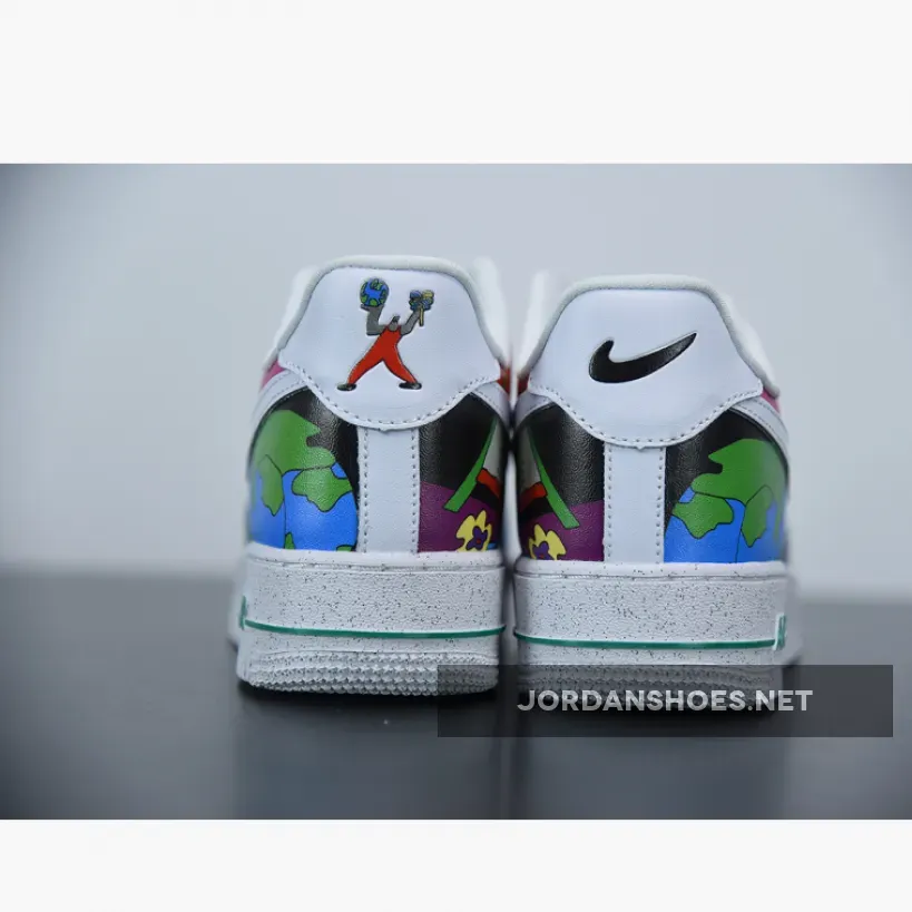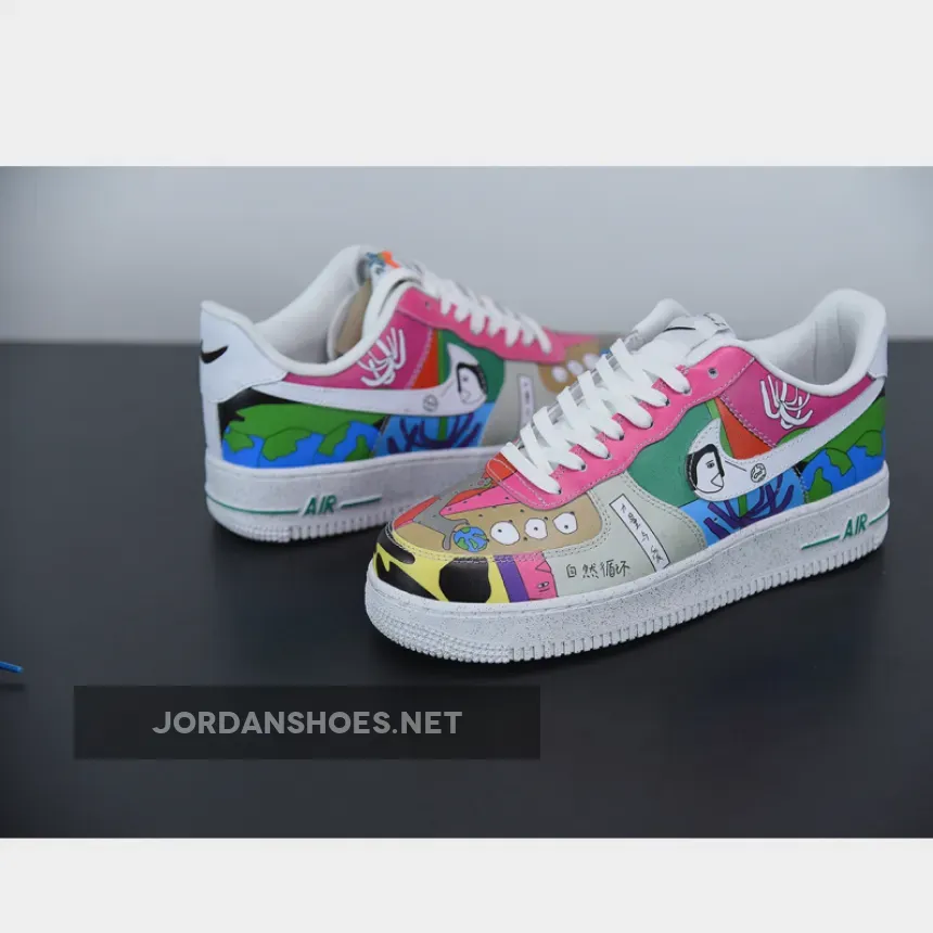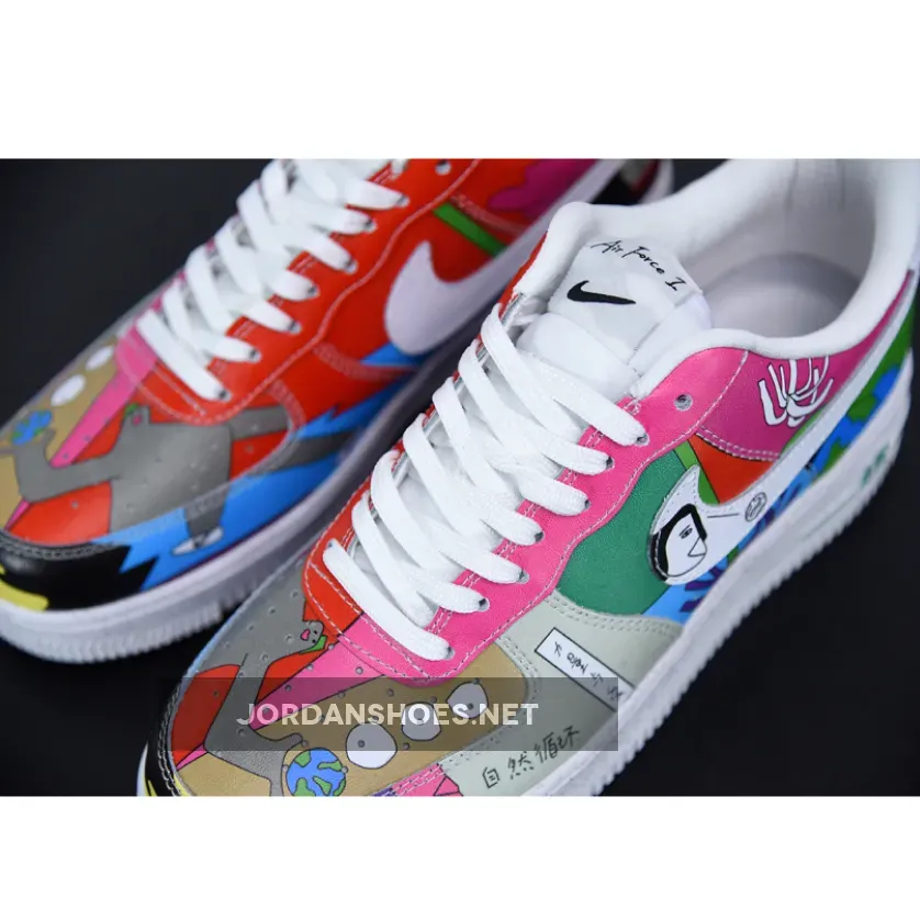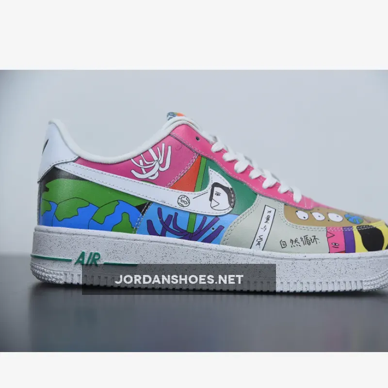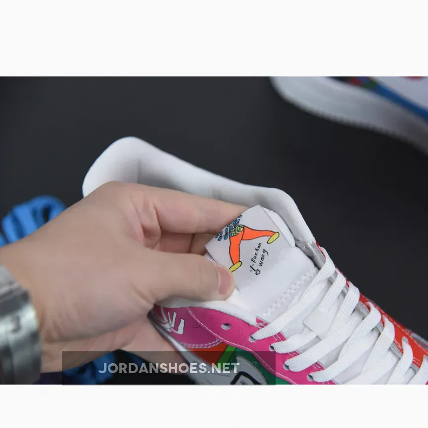While Earth-centered, the pair does delve into themes adjacent — all, however, undoubtedly of the same intentionally crude art style. Anthropomorphic figures sprawl along the forefoot, swoosh, and heel in seldom, either speaking via Chinese characters, looking towards quickly pencil’d portraits of the planet, or holding it as if reminiscent of Atlas. Elsewhere, florals are reinterpreted through Wang’s lens against brighter blue backdrops, a shade that is well-utilized along the various Flyleather paneling as well as the artist’s signature-clad tongue tab. The palette, then, increases in volume as pastel pinks, saturated reds, and yellows work their way along the majority of the construction alongside more infrequent hits of light brown, grey, and white.