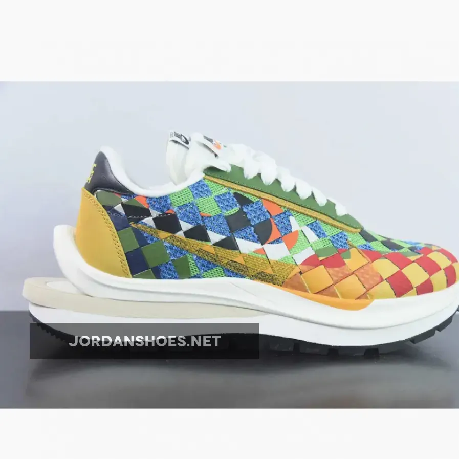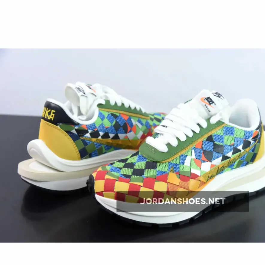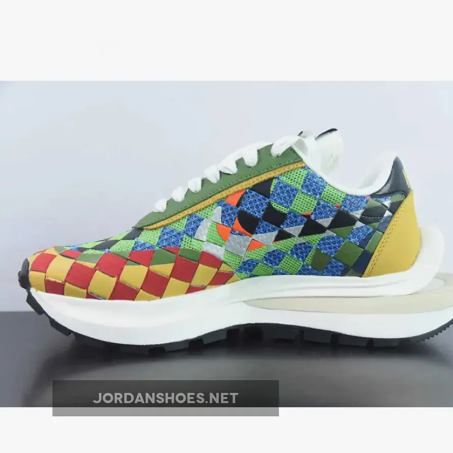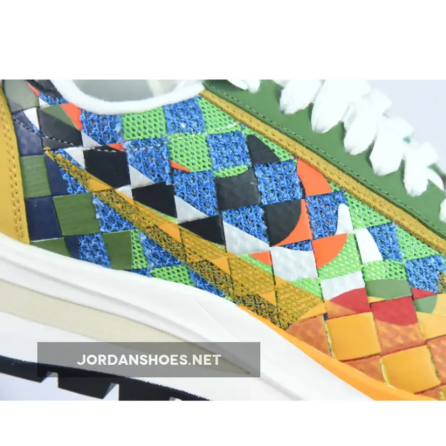 Leather and mesh are woven in a combo of green, red, yellow, and brown near the mudguard and between the upper and sole unit while the base layer features a green mesh spotted throughout the checkerboard design. Suede eyestays host a set of white rope laces that sit atop the doubled tongue which features two hits of sacai x Nike branding.