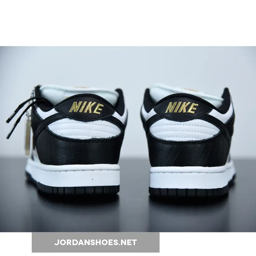 the forthcoming pair indulges in a smooth leather base that allows its contrasting surroundings to revel in the spotlight. The overlays on the low-top silhouette are muted in comparison to adjacent “Mean Green” and “Hyper Blue” options, but their faux crocodile skin construction indulges in similar statement-making. Furthermore, accompanying “Metallic Gold” dubraes, branding and midfoot star motifs; “WORLD FAMOUS” aglets; and bold red sock-liners deliver flair to the otherwise simple, skate-ready Dunk Low. Underfoot, the Air Jordan 1-reminiscent sneaker boasts a tried-and-proven “yin-and-yang” palette across its sole unit.