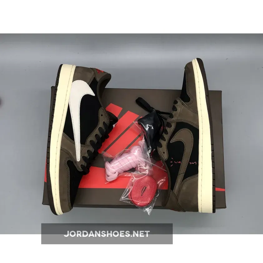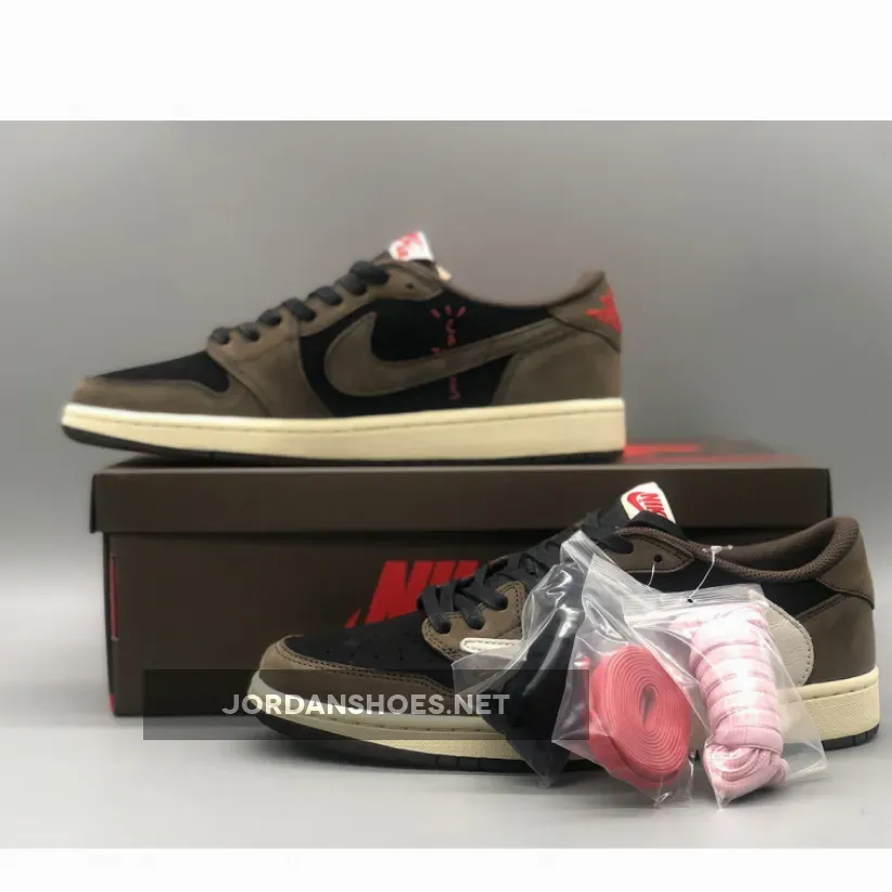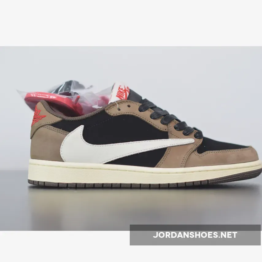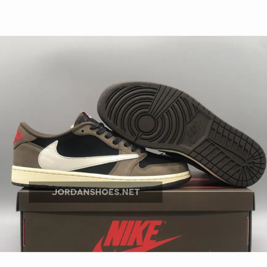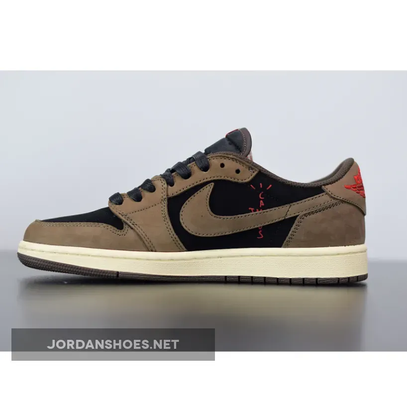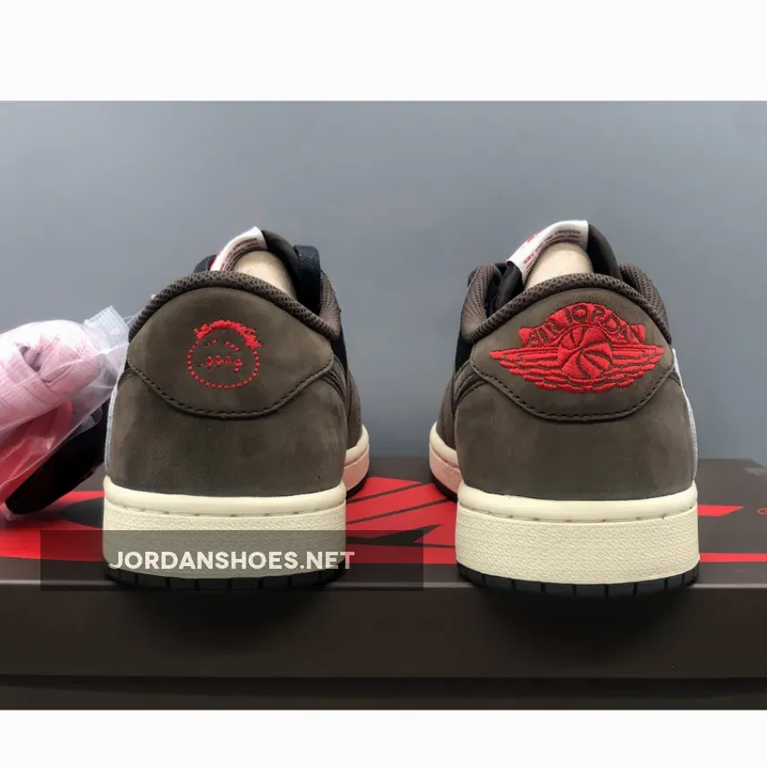 Designed as a low-top rendition of the aforementioned AJ 1 High, it sports an inverted color scheme of Black, Dark Mocha, University Red, and Sail instead. Black underlays with dark brown nubuck overlays comprise the upper, while the model is Much like his other Jordan 1, La Flame added his signature backwards Swoosh logo on the lateral side., followed by red accents throughout via Cactus Jack branding and the wings logo on the heel tabs.