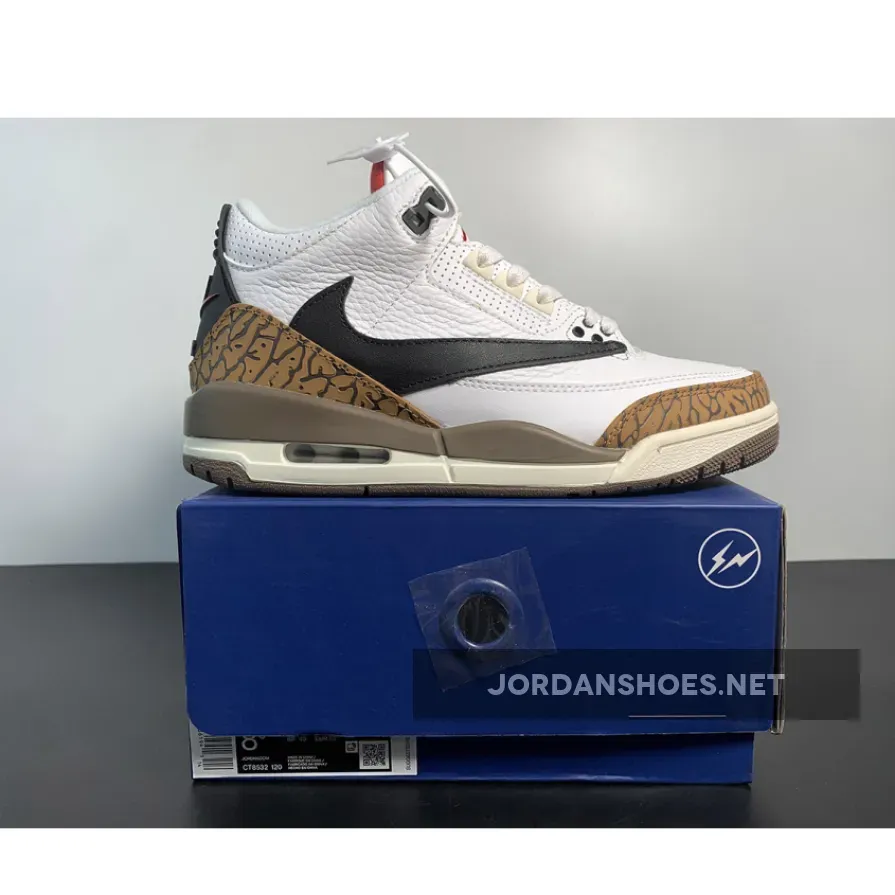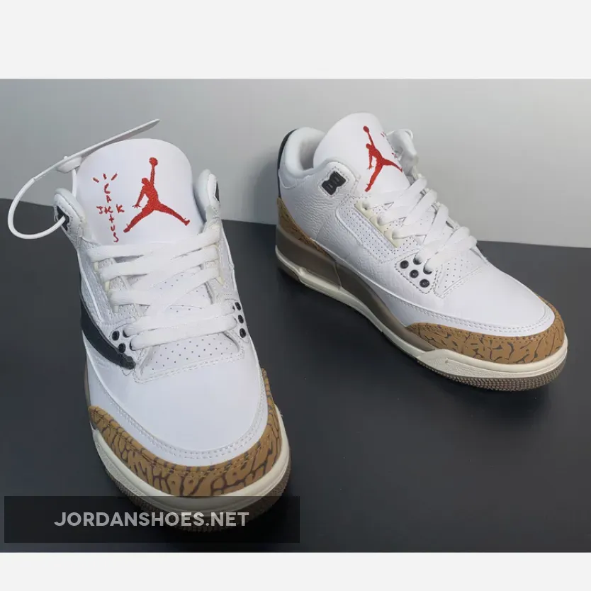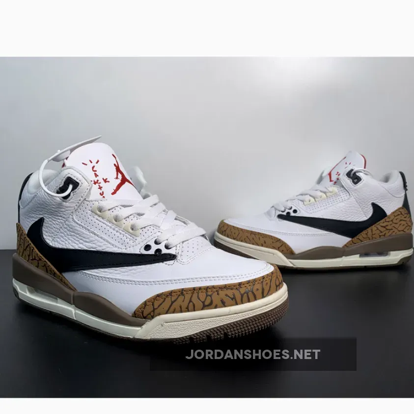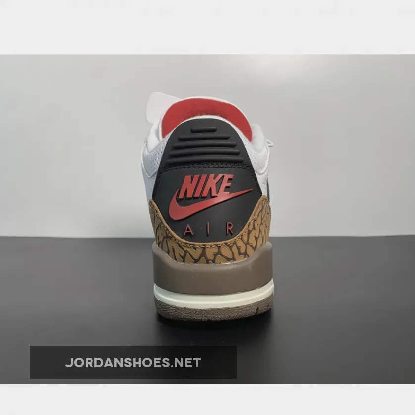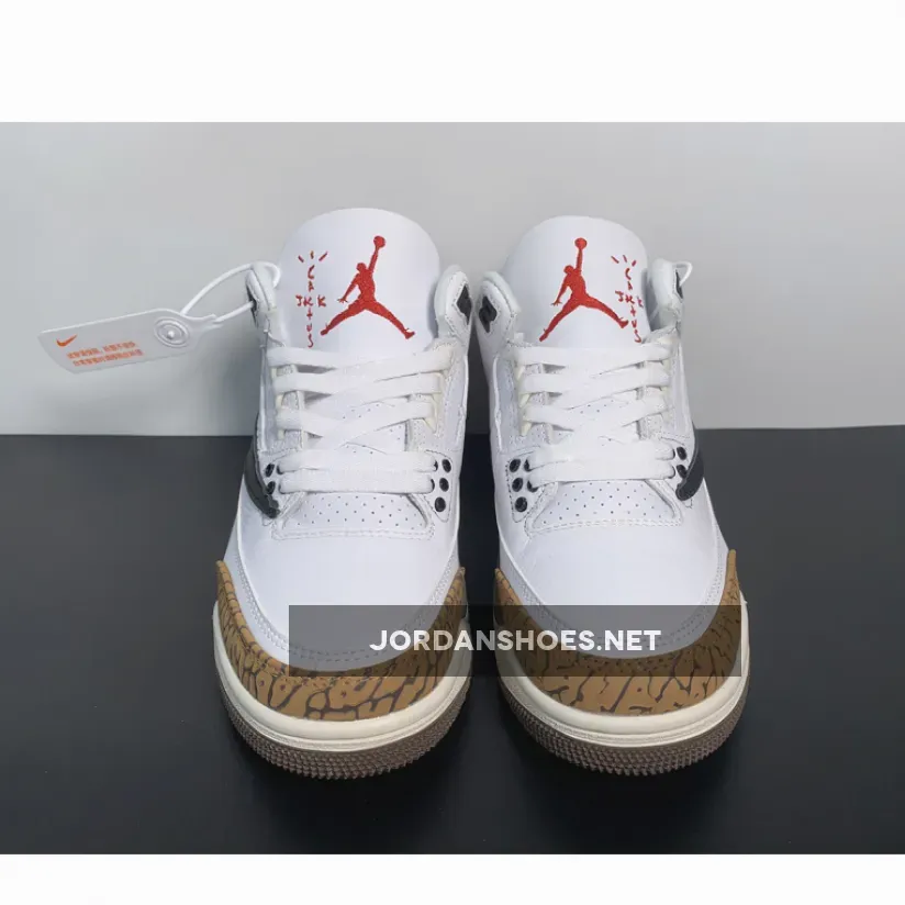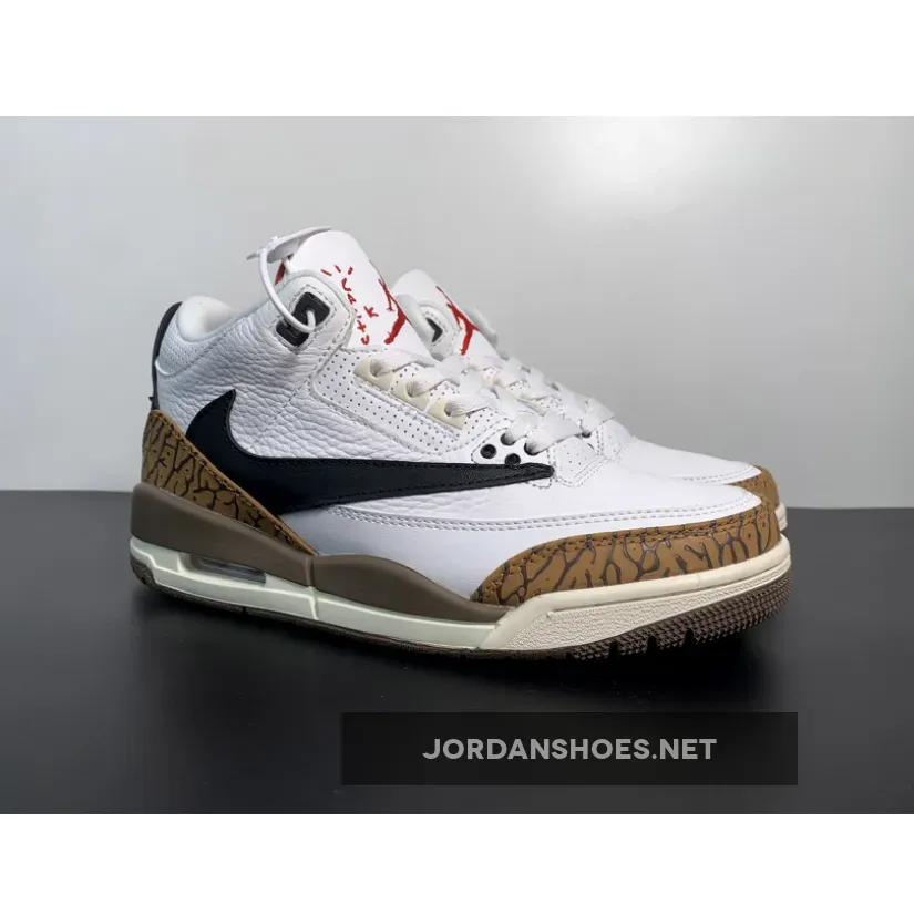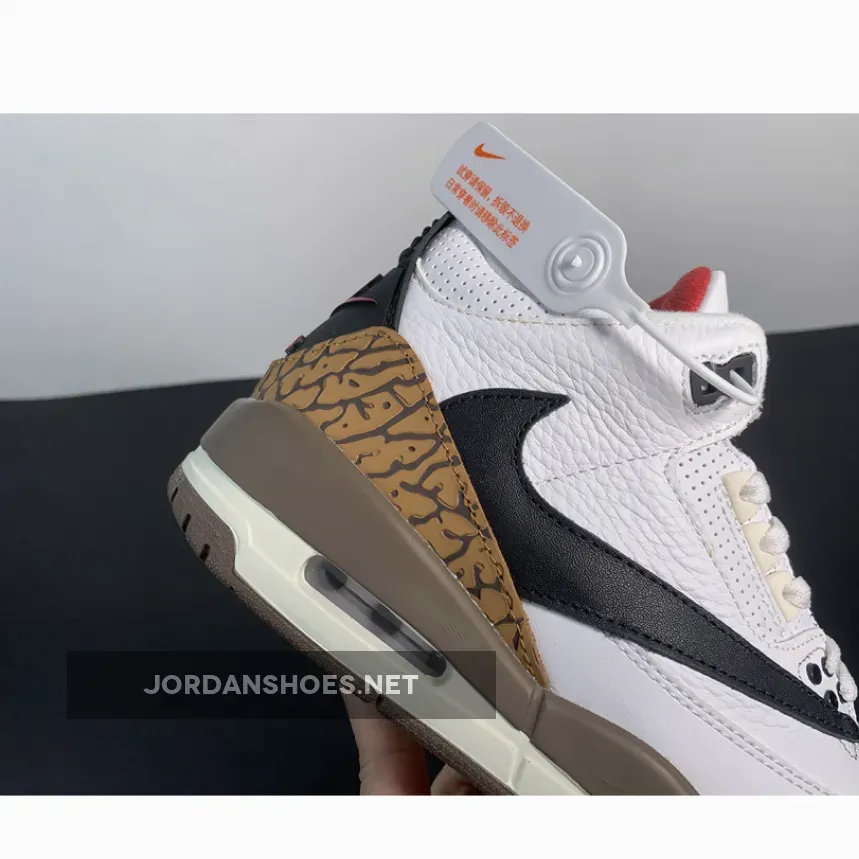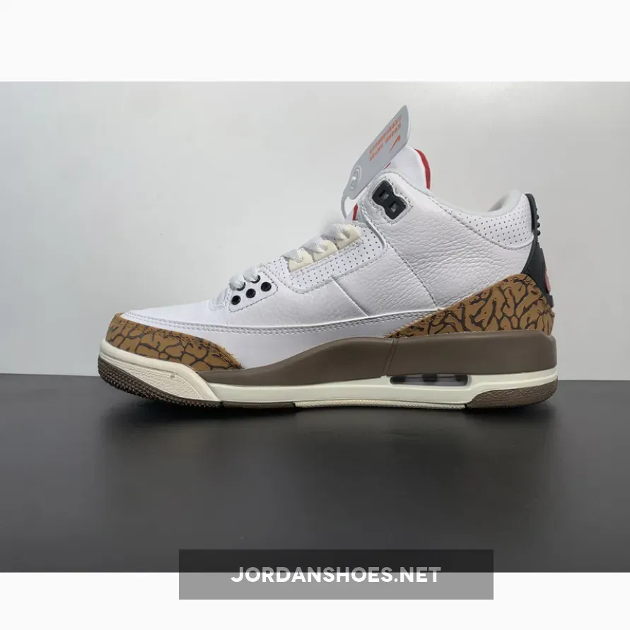 The upper of the shoe is clad in a “White / Tan / Brown / Black” color scheme. The base of the shoe is clad in a plain white hue, which is disturbed by the iconic elephant print on the heels and mudguards. The branding elements are added to the heel counters and the visible air unit on the midsole.